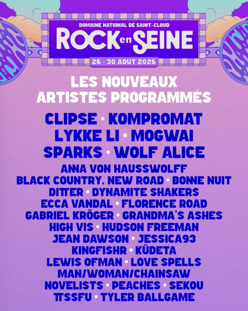 Parmi les arrivées les plus marquantes figurent Clipse, de retour après seize ans de silence discographique, Lykke Li, Peaches, Mogwai et les inépuisables Sparks. Le festival accueillera également Wolf Alice, désormais valeur sûre du rock britannique, ainsi que Kompromat, le projet explosif réunissant Vitalic et Rebeka Warrior.