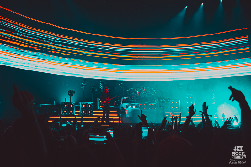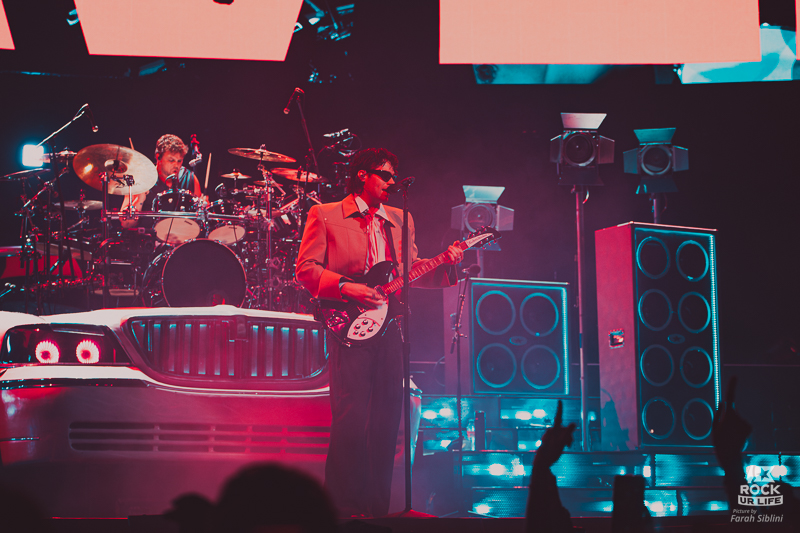 Avant même l’arrivée des deux premières parties, la scénographie se dévoile. La scène, impressionnante, adopte une forme circulaire, prolongée par une vaste avancée en fer à cheval qui s’étire profondément dans la fosse. À l’intérieur de cette boucle, dans le pit, une poignée de fans s’apprête à vivre le concert au plus près des artistes. Un écran central incurvé, épousant la forme de la scène, domine l’ensemble, flanqué de deux écrans latéraux.