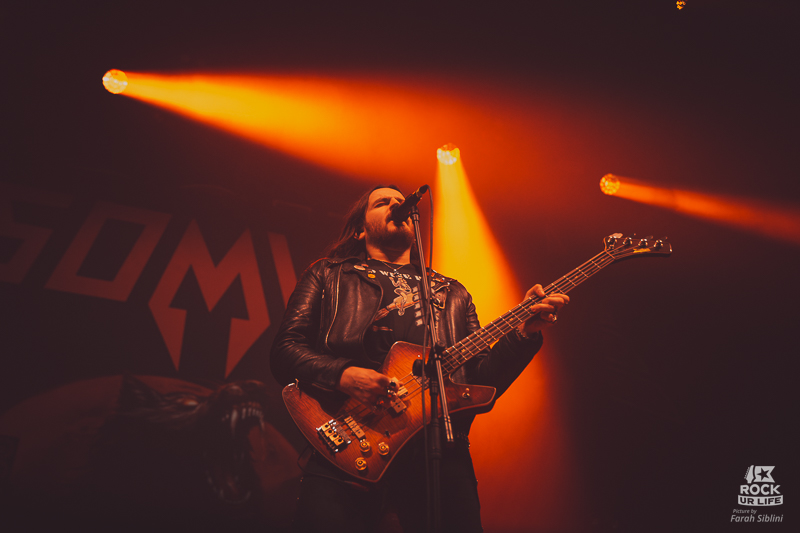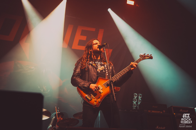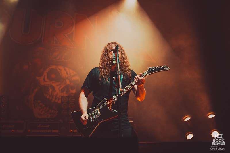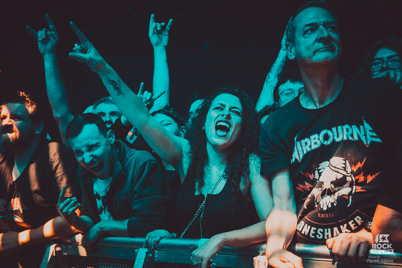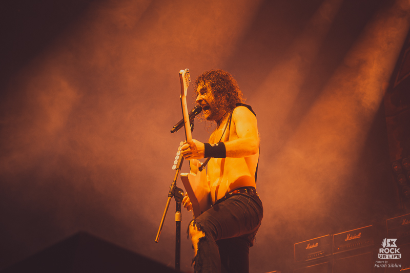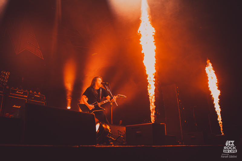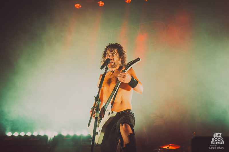 Le frontman semble toujours être autant habité par une énergie démoniaque. Il slalome d’un bout à l’autre de la scène, secoue la tête sans arrêt, arrose constamment l’assemblée de pintes de bières et enchaine les solos enflammés. Justin Street et Brett Tyrrell, devant leurs murs d’amplis Marshall verrouillent le tout d’un groove binaire précis. Headbangs synchronisés et chœurs hurlés qui gonflent chaque refrain en prime. La connexion avec le public est évidente. La foule réagit comme un seul homme, la sueur perle sous les flammes et les décibels.