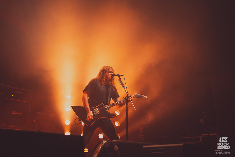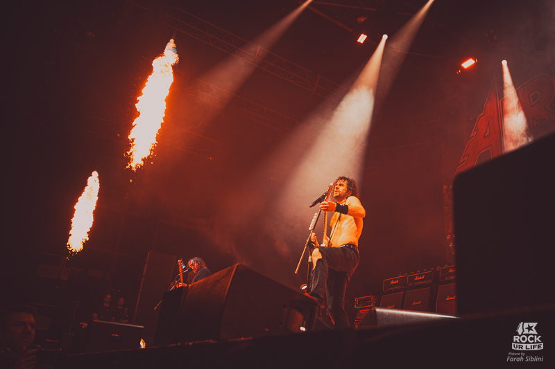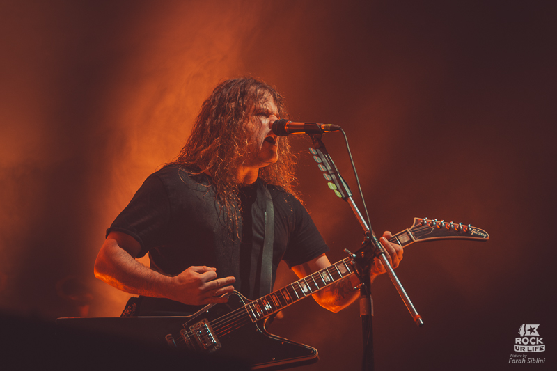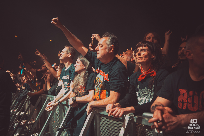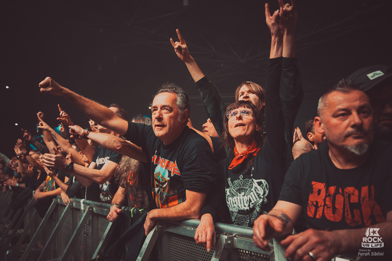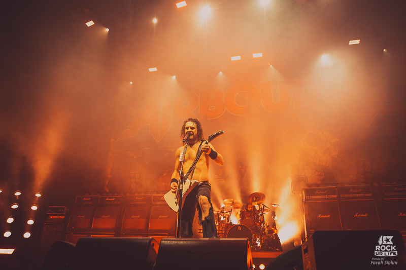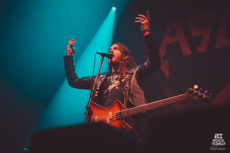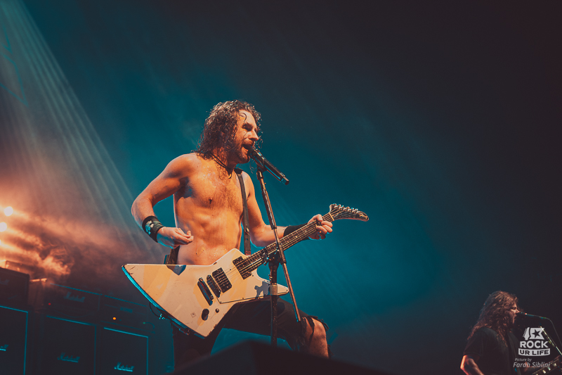 Le frontman semble toujours être autant habité par une énergie démoniaque. Il slalome d’un bout à l’autre de la scène, secoue la tête sans arrêt, arrose constamment l’assemblée de pintes de bières et enchaine les solos enflammés. Justin Street et Brett Tyrrell, devant leurs murs d’amplis Marshall verrouillent le tout d’un groove binaire précis. Headbangs synchronisés et chœurs hurlés qui gonflent chaque refrain en prime. La connexion avec le public est évidente. La foule réagit comme un seul homme, la sueur perle sous les flammes et les décibels.