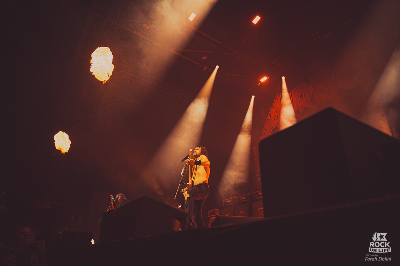 Comme à son habitude, AIRBOURNE entre en scène sur le thème de Terminator 2, cette relique musicale qui fleure l’action débridée des blockbusters des années 90. Surgissant à travers un rideau de fumée rouge et les gerbes de pyro, le titre “Gutsy” explose aussitôt. Six ans après Boneshaker, il s’agit du premier single éponyme du nouvel album, prévu le 24 juillet 2026. Immédiatement, on sent le mur de guitares s’abattre comme une enclume, le kick cogner comme un marteau-piqueur dans la poitrine, et la basse faire trembler murs et tripes. Ce son massif promet 90 minutes d’un tunnel énergétique, cette force brute qui colle à la réputation du gang de Warrnambool, en Australie. La salle bascule d’un coup, emportée par la déferlante.