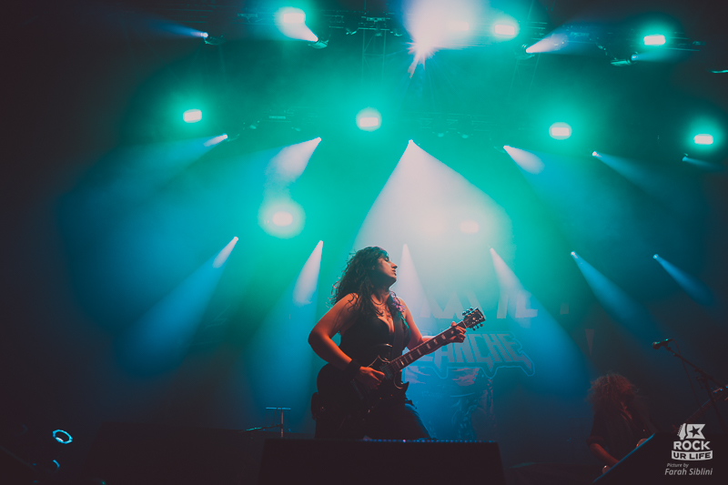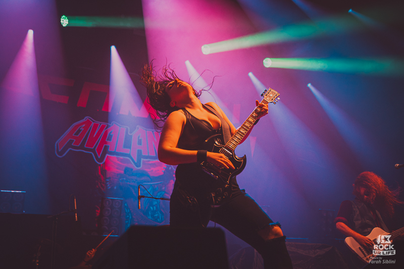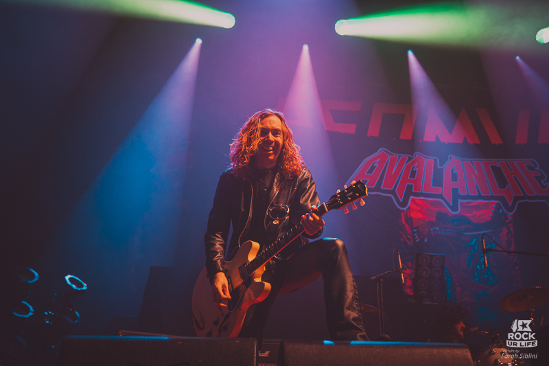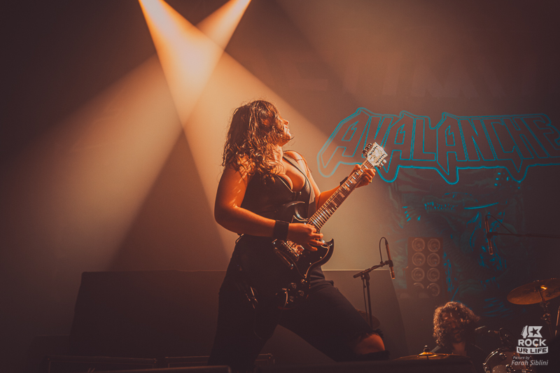 Il ne faudra pas attendre longtemps pour voir la salle s’enflammer. Les premiers gobelets s’envolent, les slams surgissent, les moshpits s’ouvrent en quelques secondes. Dans la fosse, ça pousse déjà fort. Sur scène, AVALANCHE joue sa carte à fond. Chant braillard, riffs directs, section rythmique qui cogne sans retenue, solos pentatoniques envoyés avec le sourire en coin. La recette est connue, assumée, efficace.