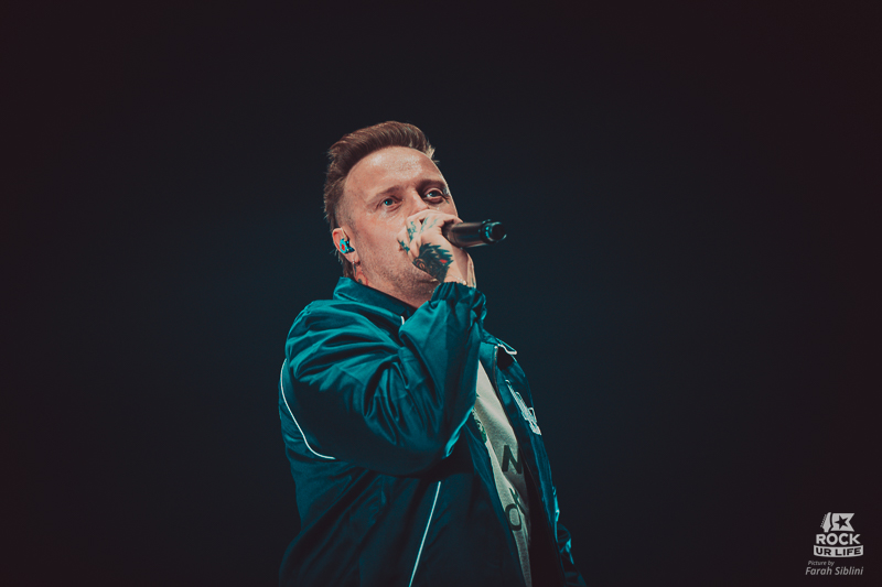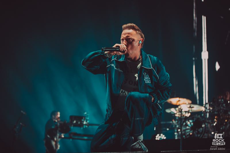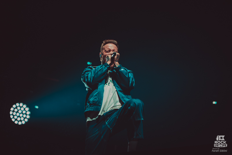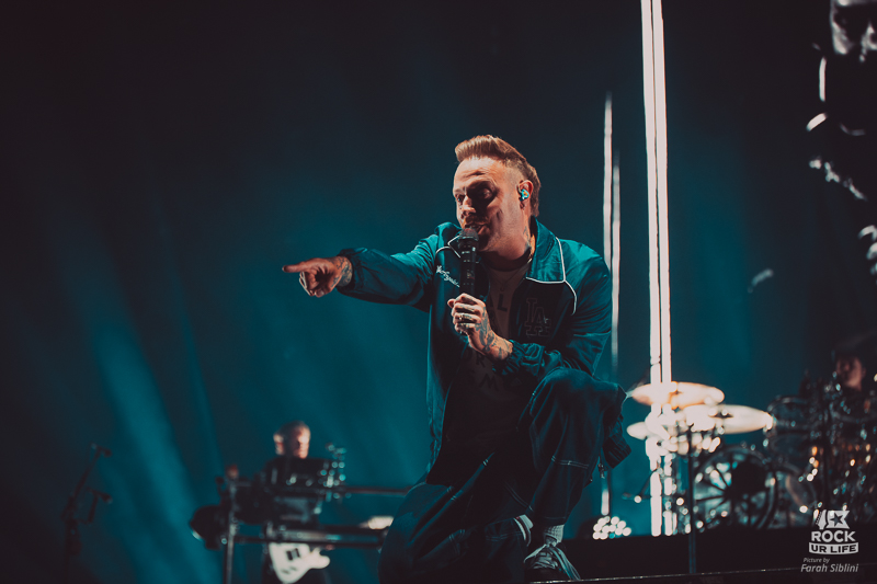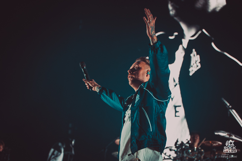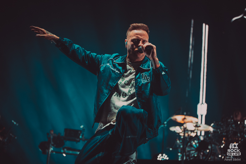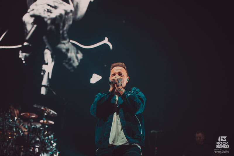 Il est environ 21h45 lorsque retenti un morceau annonciateur : “Don’t Stop Me Now” de Queen. Les fans reconnaîtront là un signe de ralliement, le titre lançant également les concerts de la tournée européenne du printemps dernier. L’occasion également de se rendre à l’évidence : la salle ne sera pas pleine ce soir. Qu’importe, la clameur du public comble rapidement le vide lorsque les lumières de la salle s’éteignent pour faire place à l’intro stroboscopique de “Elegy”. La scénographie, sobre mais résolument moderne s’accorde parfaitement avec les ambitions de grandeur de ARCHITECTS. Ponts de lumière mouvants, écran géant central et son caméraman attitré, plateforme a deux niveaux et un Sam Carter prêt à dévorer l’Arena. “Whiplash” et “when we were young” finissent de lancer le set avec une intensité folle. Le son est massif et l’émotion est palpable. Carter lâchera même un “Oh my god“, réalisant l’accueil puissant que lui a réservé son audience parisienne.