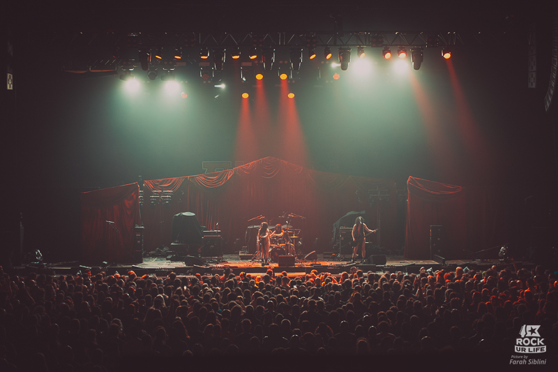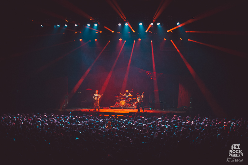 Soudain, le décor bascule. Le bruit du vent et des vagues envahit la salle. Les premières notes de “Captain Goat” retentissent et la batterie se scinde en deux blocs, révélant les musiciens à bord d’un bateau qui fend littéralement la scène. Les yeux des Parisiens brillent, mais l’accalmie est de courte durée. L’introduction théâtrale cède brutalement la place à la furie de “Silence In The Age Of Apes”. La machine à laver démarre : la fosse explose dans un mosh pit immédiat.