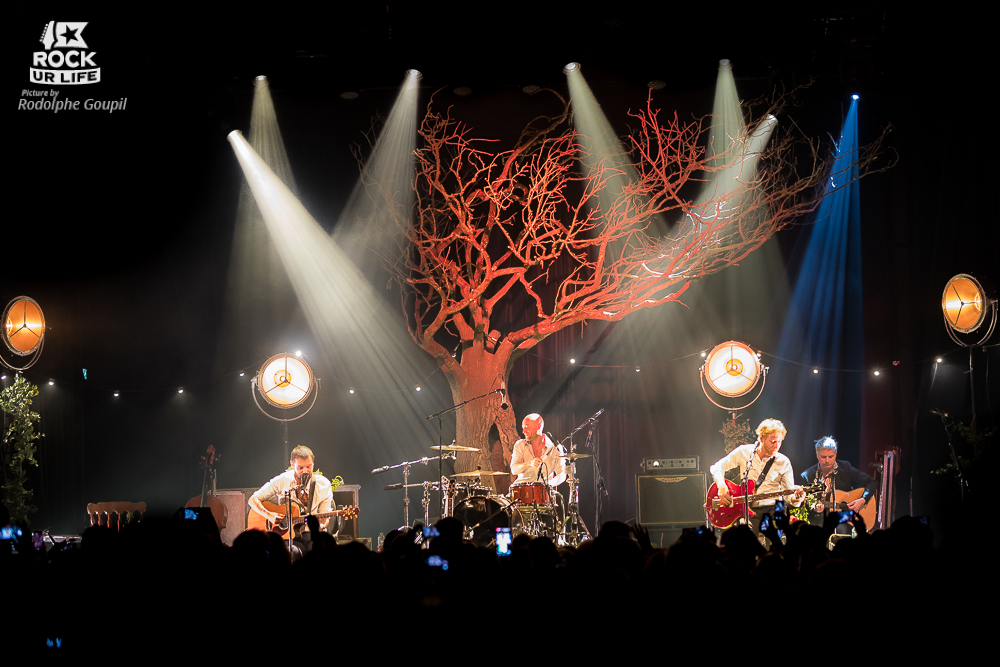 Les natifs d’Aberdeen THE XCERTS se faufilent donc en premier parmi la végétation décorant la scène. Pour sa tournée “Unplugged”, Biffy Clyro voit les choses en grand et voyage avec une scénographie similaire à celle du concert filmé pour MTV. Végétaux jonchant le sol, lierre et compositions florales s’enroulant autour des instruments et des éléments de décor, guirlandes lumineuses diffusant un éclairage chaleureux, tout ça sous les branches d’un arbre tortueux trônant au fond de la scène. Dans ce cadre intimiste et idyllique, pas question de faire rugir des guitares. Pour son court set, The Xcerts fait donc également passer son pop rock par la case acoustique. Et si la voix de Murray Macleod est toujours aussi appréciable, les morceaux, presque tous extraits du trop poli “Hold On To Your Heart”, perdent en intensité sous cette formule, rendant le set assez insipide. Pas désagréable, mais pas vraiment marquant non plus.