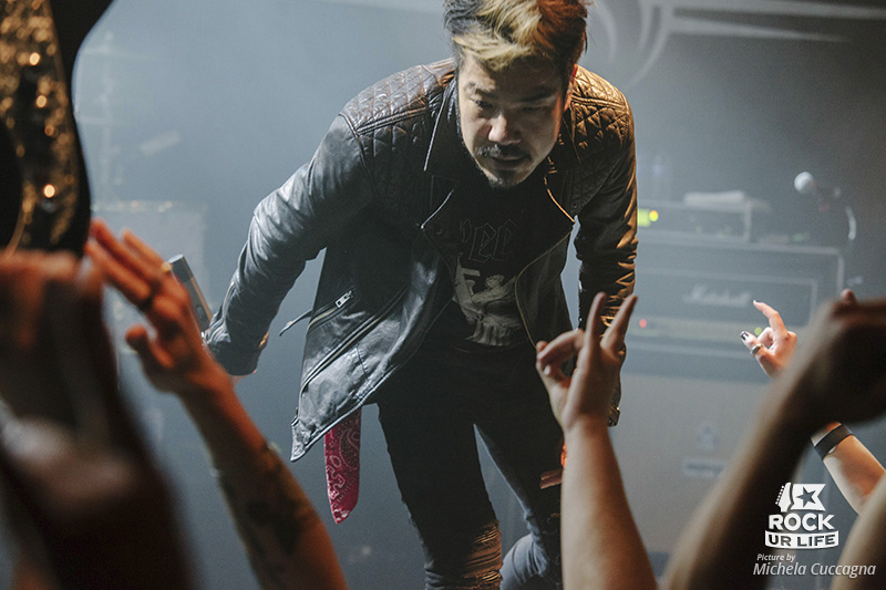 Et le partage, ces Japonais connaissent bien. Ils n’hésitent pas à s’approcher au plus près de l’audience, en montant sur les enceintes, ou en s’élançant corps et âmes dans la foule. La salle de concert s’est transformée en une masse informe, qui se colle jusqu’à fusionner. Les premiers rangs sont couchés sur la scène, les artistes au-dessus d’eux. On s’échange sourires et signes de main, y compris des doigts d’honneurs mêlés à des rires sur “Eclipse”. Le titre “Madness” aurait été approprié. Tamano Terufumi (claviers/machines) ne cesse de bondir dans tous les sens, monter sur son clavier, grimacer, jouer avec les fans. Mais il y aura peu de moments comparables à celui où les garçons joueront “Wildfire”, sur lequel Benji Webbe (Skindred) ne sera malheureusement qu’un enregistrement : on danse, on rit, on se met à genoux pour ensuite sauter à l’unisson, on se filme. Rien ne semblerait pouvoir mieux résumer l’esprit festif de la soirée. Pas même le délectable solo de batterie d’Amano Tatsuya lors du rappel, ni même l’explosive reprise du “Omen” de The Prodigy. C’était une “Devil’s Party”, diaboliquement entraînante, si bien que l’on n’aura aucun scrupule à chanter “Countdown To Hell”. Si l’enfer ressemble à ça, on signe tout de suite. Si les coups reçus dans le pit font partie du chemin de croix, c’est un plaisir de les subir, car nous avons foi en ce que nous propose le quintette.