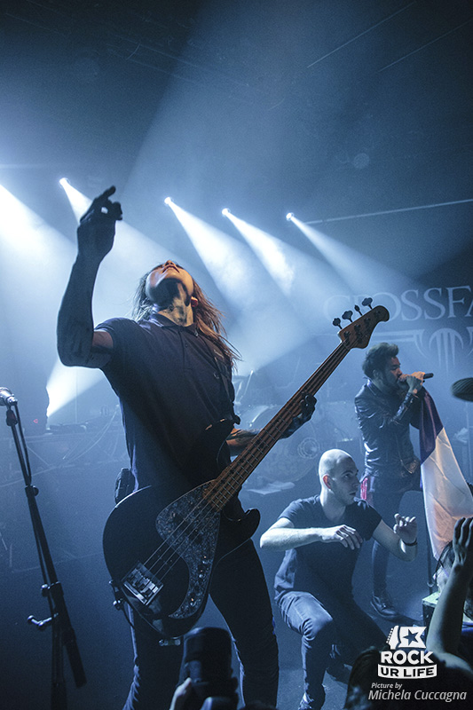 Il est temps pour CROSSFAITH de faire son entrée au Trabendo, qu’il foule pour la seconde fois de sa carrière, la dernière fois étant en compagnie de Skindred. Les musiciens ouvrent les festivités sur “System X”, chanson ouvrant le dernier album, “Xeno“. Cette entrée en matière magnifie toute la richesse de ce terme “étranger” : l’étrangeté de ce son hors-norme, mais aussi celle qui n’existe plus à travers la musique. Le chanteur nous touchera quelques mots à ce sujet, en exprimant que nous avons beau avoir des origines différents, du sang différent, une couleur de peau différente, un langage différent, etc. Plus aucune différence n’existe avec la musique. Nous ne sommes plus qu’un. Filant ainsi la métaphore créée avec The One Hundred. Et c’est bien cela que la formation compte faire savoir et célébrer. “Raise Your Voice” est ainsi le premier mot d’ordre de ces festivités. Il ne faut plus se taire, mais s’exprimer, et partager.