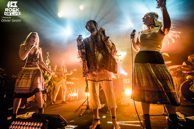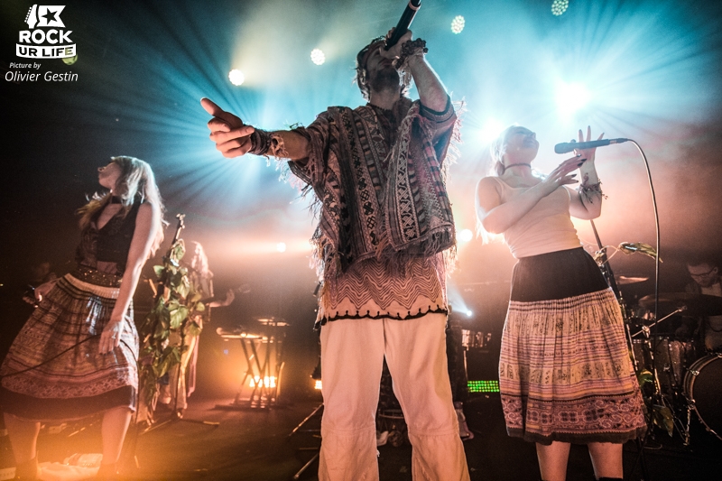 En rang, les trois chanteurs, Sebastian Pringle, Ellie Fletcher et Nila Raja rivalisent de charisme et multiplient les harmonies mélodieuses. Le leader laisse la place aux deux blondes sur les plus énervés “I Love London” et “I Do This Everyday”. Leur complicité et leurs attitudes presque punks dégagent une intensité d’une puissance prodigieuse. En empilant à la suite son nouveau tube “Ways I Can’t Tell”, Crystal Fighters achève de transformer le Trabendo en un dancefloor euphorique. La setlist ne laisse aucun répit, l’électro faisant place au folk en toute fluidité. Sebastian Pringle, avec ses airs de chaman, prêche le vivre ensemble et l’amour et embarque l’assemblée dans une sorte de grande messe. La deuxième partie du set voit le groupe se tourner vers ses compositions plus folks. Des solaires classiques “You & I”, “Plage” et “Love Natural” aux nouveautés fédératrices “Lay Low” et “Good Girls”, les six hippies alternent entre hymnes à la fête et odes à la vie et à l’amour. Toute inhibition a disparu, la salle tout entière gesticule dans une frénésie collective.