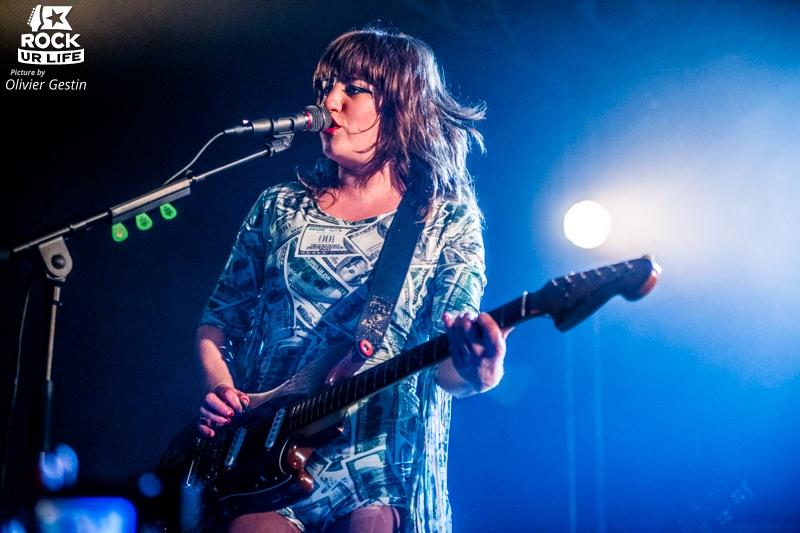 Quelques trente minutes après la fin de cette alléchante entrée en matière, c’est au tour de DEAP VALLY de s’emparer de la scène. Le public a à peine le temps de les acclamer que les deux femmes foncent avec “Little Baby Beauty Queen”, l’un des titres particulièrement énervé du nouvel album. Pas de répit, elles s’attaquent ensuite au survolté “Bad For My Body”, toujours aussi efficace. À leurs pieds, l’assemblée est concernée mais reste plutôt réservée. Hargneuses et exaltées, Lindsey Troy (chant/guitare) et Julie Edwards (batterie) s’attaquent à leurs instruments avec ardeur. Toutes deux pieds-nus, l’une arbore des collants filés, l’autre des cheveux roses délavés. Tout dans leurs looks comme dans leurs attitudes crie un je-m’en-foutisme et une liberté absolue. Elles brodent aux anciens morceaux leurs compositions tout juste déballées. Après un mois passé à arpenter l’Europe de long, en large et en travers en jouant ces nouveautés, les deux Californiennes les maîtrisent tout aussi bien que leurs anciennes créations et le tout se mélange sans réelle distinction. Parmi les nouvelles têtes ayant fait apparition dans la setlist, l’hymne libérateur “Gonnawanna”, déjà exaltant sur sa version studio, est l’un des meilleurs. Quand Lindsey Troy assène le refrain “je vais faire ce que je veux” en boucle, c’est un vent émancipateur qui souffle sur la salle entière. Quant au single féministe “Smile More”, il sonne déjà comme un classique, reprit timidement par la foule.