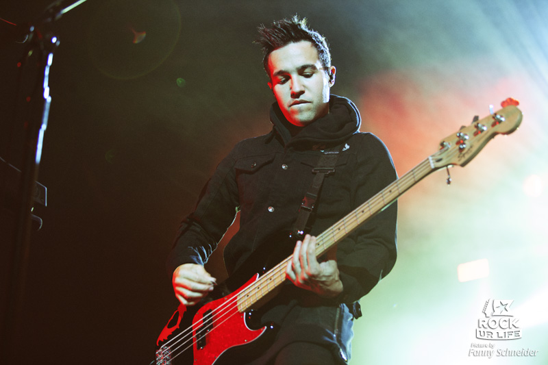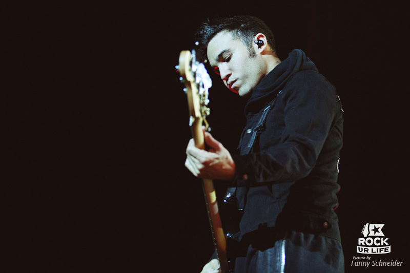 Un peu plus d’une demi-heure plus tard, les FALL OUT BOY font à leur tour leur entrée, sur une scène équipée en son centre de rampes, entourant la batterie réhaussée d’Andy Hurley. La salle désormais quasi comble réserve un triomphe au quatuor, qui entame sa performance cagoules en têtes avec l’hyper énergique “The Phoenix”, Pete Wentz agitant un drapeau au nom du groupe. Les quatre complices enchaînent sans tarder avec l’efficace “I Slept With Someone In Fall Out Boy…”, avec aux commandes un Patrick Stump très en forme vocalement, et à ses côtés un Joe Trohman gonflé à bloc, qui tourne sur lui-même et utilise les rampes pour faires des bonds. L’énorme énergie dégagée par les américains est palpable et contamine sans peine le public, qui s’agite aussi bien dans la fosse que dans les gradins. La bande poursuit avec deux anciens morceaux devenus incontournables, “A Little Less Sixteen Candles, A Little More””Touch Me””, et “This Ain’t A Scene, It’s An Arms Race”, pour le plus grand plaisir de l’assistance. Mais la setlist inclut bien évidemment aussi plusieurs morceaux issus de “Save Rock And Roll“, notamment “Alone Together”, “Death Valley”, “Young Volcanoes”, et “Just One Yesterday”, savamment distillés parmi les grands succès du combo, le dénommé “Sugar, We’re Goin Down”, la reprise de Michael Jackson “Beat It” ou encore “Dance, Dance”. Si Patrick Stump et Pete Wentz se partagent la tâche d’annoncer les morceaux à venir, c’est véritablement Pete qui anime cette soirée, discutant avec le public et l’incitant à donner de la voix, même si la foule ne comprend pas tout ce qu’il dit. Parmi les moments à retenir ce soir, les solos respectifs de Joe Trohman et d’Andy Hurley, le lâcher de ballons pendant le festif “Young Volcanoes”, l’ambiance intimiste de “Just One Yesterday”, avec une salle éclairée uniquement par la lumière des portables, mais aussi et surtout le set acoustique organisé vers le milieu du concert, pour lequel Patrick, Pete et Joe s’installent sur une petite scène secondaire au cœur de la fosse. Et c’est deux anciens titres qui sont mis à l’honneur dans cet intermède, “I’m Like A Lawyer… (Me & You)” et “Nobody Puts Baby In The Corner”. Plus tard, après avoir remercié le public comme il se doit, les Fall Out Boy nous quittent avec le morceau qui a signé leur retour, l’excellent “My Songs Know What You Did in the Dark (Light ‘Em Up)”.