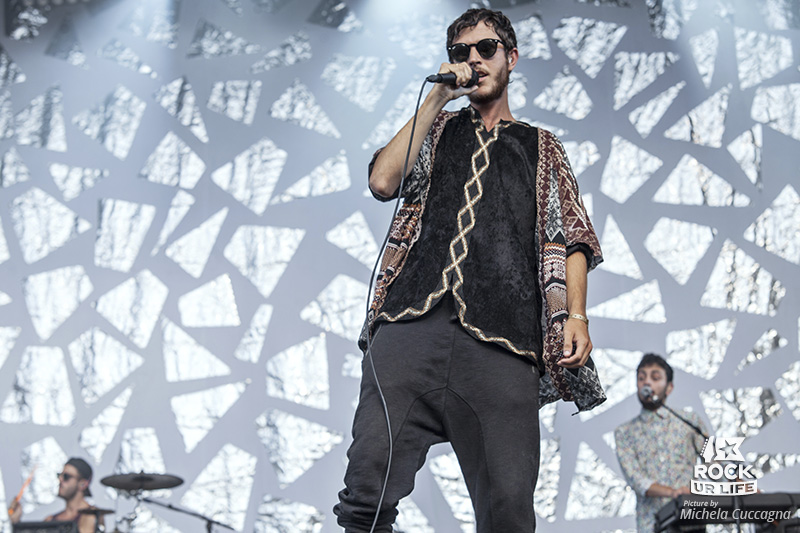 OSCAR AND THE WOLF – 18h30, les Belges entrent en scène au rythme des synthés. Max Colombie (chant) virevolte, pieds nus sur scène. Il ne tardera pas à regretter son choix tellement le sol est bouillant, chauffé par ce soleil d’été qui nous a tant gâté cette année. Mais qu’importe, il assurera tout le show comme cela le sourire aux lèvres. Le groupe s’aventure sur des terres électro rock, à la fois minimaliste, parfois atmosphérique, souvent mélancolique. Cela prend doucement et l’audience, captivée par ce grand brun aux lunettes noires et à la voix de velours venu raconter ses histoires de cœur, commence à se lâcher. 19h20, ils quittent déjà la scène nous laissant un peu sur notre faim. Ils ont conquis la foule et laissent une certaine douceur flotter dans l’air.