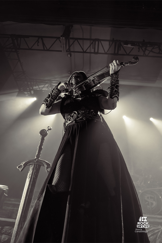 La première partie était assurée par MIRACLE OF SOUND, projet de l’Irlandais Gavin Dunne qui s’est entouré d’un groupe de musiciens talentueux pour interpréter ses compositions live sur scène. Dès les premières notes, le public répond présent. La soirée s’ouvre avec l’intense “Deceiver”, rapidement suivi de “Gráinne Mhaol, Queen Of Pirates”, porté par une énergie irlandaise fédératrice. Dans la même veine, “Sirona”, premier single de l’album à venir, s’impose avec efficacité, fusionnant atmosphères festives celtiques et puissance metal. On réalise alors à quel point un solo de violon peut électriser la foule – même lorsqu’il est diffusé en bande-son (ce qui reste toutefois un léger bémol…).