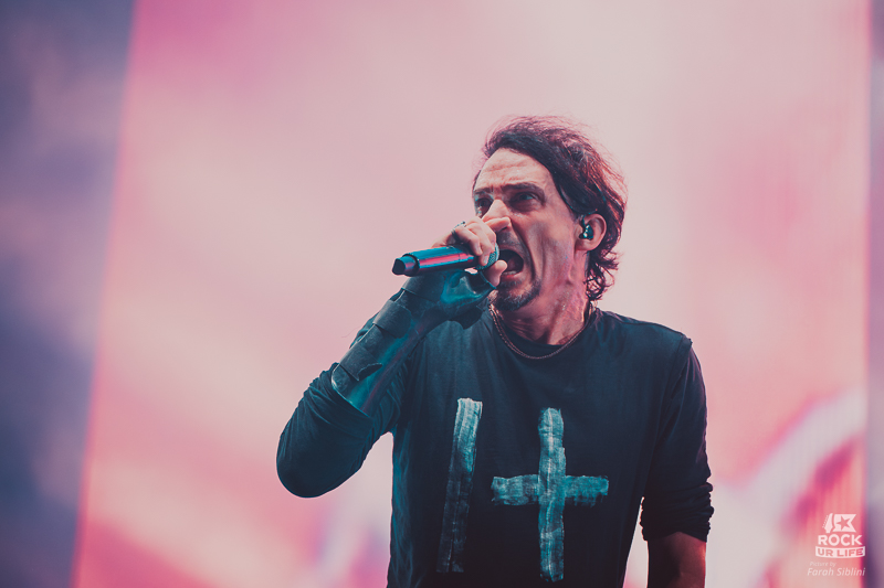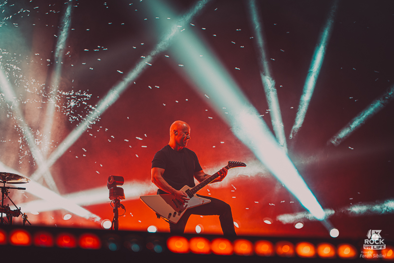 21h. Les lumières s’éteignent, quelques animations s’emballent sur l’écran de fond avant que “Only Pain” ne fasse exploser l’Accor Arena. Le son de GOJIRA est massif et plutôt clair, tandis que les écrans latéraux offrent des gros plans sur chaque musicien, répartis sur deux niveaux de scène. D’emblée, on comprend que la blessure de Joe, visible avec son orthèse, n’a pas amputé la bête. Il faut reconnaître que Greg Kubacki, monstre de dextérité officiant chez Car Bomb, assure sans trembler les rythmiques de Duplantier. Délesté de son instrument, Joe endosse son rôle de frontman, occupe l’espace et livre une performance vocale tout en muscle. “The Axe” et “Backbone” enfoncent le clou, portés par des effets stroboscopiques qui collent parfaitement à la rythmique. La machine Gojira est toujours aussi précise et semble plus vivante et immersive que jamais.