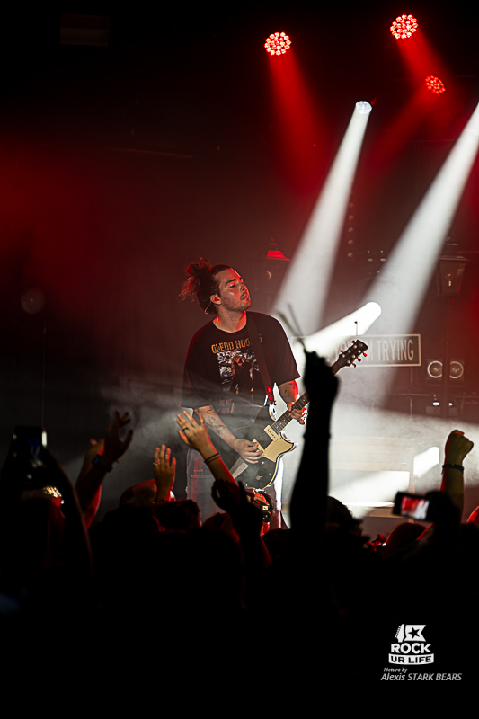La foule est déjà bien compacte et chauffée à la bière lorsque le trio NOISY se faufile sur la scène minuscule du Trabendo. La fumée épaisse ainsi que la chaleur étouffante n’empêchent pas les artistes et le public de tout donner dès le premier titre. Cody, leader charismatique et survolté, épate par son phrasé tranchant. Il multiplie les occasions de remercier le public pour son soutien, et témoigne à quel point il est heureux de se produire à Paris ce soir. La guitare et la batterie produisent des mélodies rock acérées, tandis que les enceintes crachent également des sonorités électroniques pré-enregistrées. Bien que le son joué en live ne fusionne pas toujours bien avec les enregistrements, l’énergie déployée par le leader rend le set particulièrement captivant. Entraînant l’assemblée avec lui à base de “Let’s go!” distillés ici et là, il en sera récompensé lorsque, après quarante minutes à bondir dans tous les sens, une marée de cœurs avec les doigts raccompagne les musiciens vers les loges.