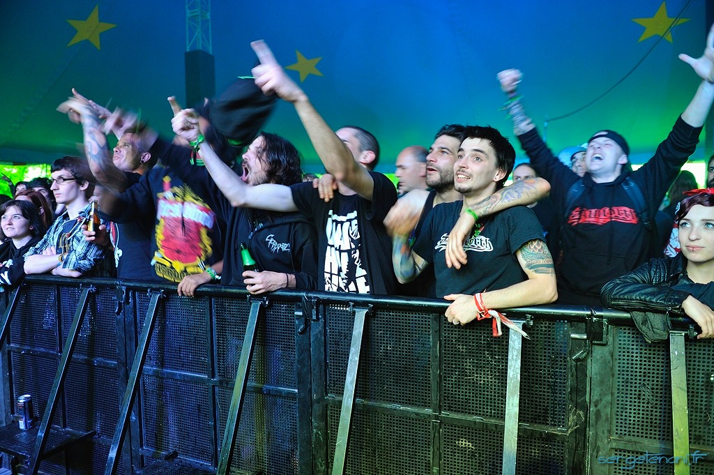 L’apéro libéré plusieurs dizaines de milliers de fois la veille, que ce soit sur le camping ou au Metal Corner, les décibels se sont chargées de réveiller la foule le jeudi également. Parmi les nombreux groupes, WILD DAWN aura imposé son gros rock’n’roll stoner des familles. Une excellente prestation fortement saluée. Ils seront rapidement suivi par l’énorme set de DANCEFLOOR DISASTER où musiques de clubbers et metalcore se sont associées. Un grand délire où la foule aura joué un rôle plus qu’important pour animer les débats. Il faut dire qu’un “Gangnam Style” bien plus péchu que l’original aura eu le don de faire bouger une horde de metalheads, on marche sur la tête ? NON, THIS IS HELL FUCKIN FEST !