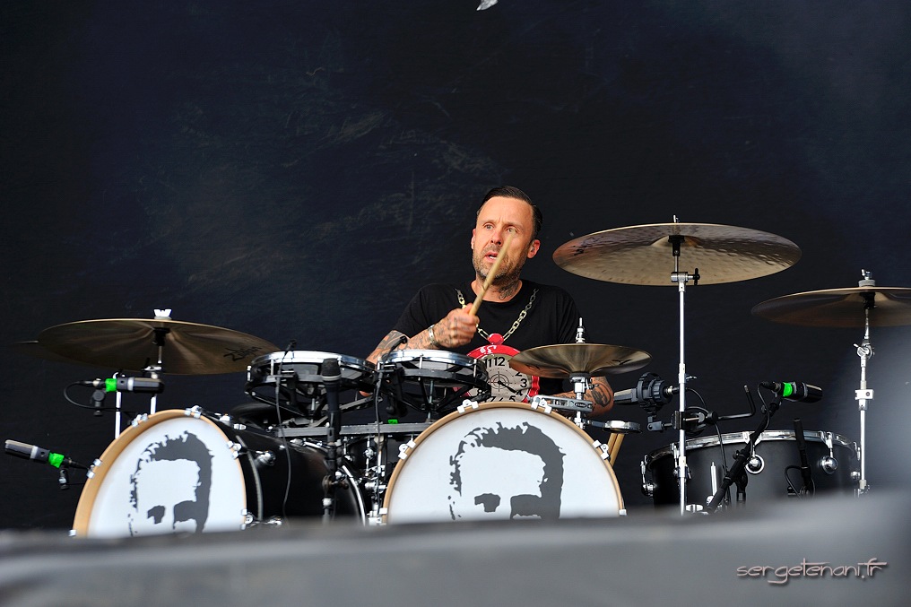 Les rockeurs devraient être comblés, la soirée va se terminer en beauté, sur la MS1, en compagnie de VOLBEAT, qui prend les traits d’une tête d’affiche d’un soir. Alors que leur succès est d’une évidence certaine en Europe, la France succombe petit à petit à la formation menée par Michael Poulsen. Ainsi, c’est une véritable aubaine qui leur tend les bras, que d’headliner le plus gros festival metal de l’Hexagone. Accompagné d’Anders Kjølholm et de Jon Larsen, ces derniers furent rejoints par Rob Caggiano (ex-Anthrax), qui récupère le poste laissé vacant par Thomas Bredhal. Rob fut également aux manettes de la production du dernier opus “Outlaw Gentlemen & Shady Ladies“. Les lourdes guitares droppées de la formation vont d’emblée faire mouche. Une partie du public semble découvrir la formation et adhérer à leur musique. Les cinq efforts studios du groupe seront mis à contribution durant les quatre-vingt-dix minutes de concert. Barney (Napalm Death) fera une brève apparition sur le titre “Evelyn”. De plus, comme tout au long du week-end, Volbeat ainsi que de nombreux groupes rendront hommage à Jeff Hanneman (Slayer), décédé quelques semaines auparavant; ainsi le medley sur “Raining Blood” réchauffera les festivaliers, alors que la nuit s’annonce fraiche. “Sad Man’s Tongue” fera son effet et le bluesy rockabilly du groupe trouvera son public. En cette fin de festival, il sera possible de remarquer avec stupeur que de nombreuses personnes vont se “lâcher” ou bien “péter les plombs”, créant ainsi des circle-pit délirant, chacun évacuant les derniers restes d’énérgie qui se trouvent aux quatre coins des organismes, une transe contrôlée et tellement géniale à observer (et à pratiquer *sic*). Le concert continue de belle manière, les backdrops se suivent et laissent place à différents visuels. “Doc Holliday”, “The Mirror And The Ripper” et “Pool Of Booze, Booze, Booza” concluent, en guise de rappel, ce très bon show. Soyons tout de même objectif, même si Volbeat n’a pas (encore) la carrure d’une tête d’affiche au Hellfest, leur bon vieux rock fait mouche et les festivaliers en ressortent avec le sourire, l’important est bien là !
