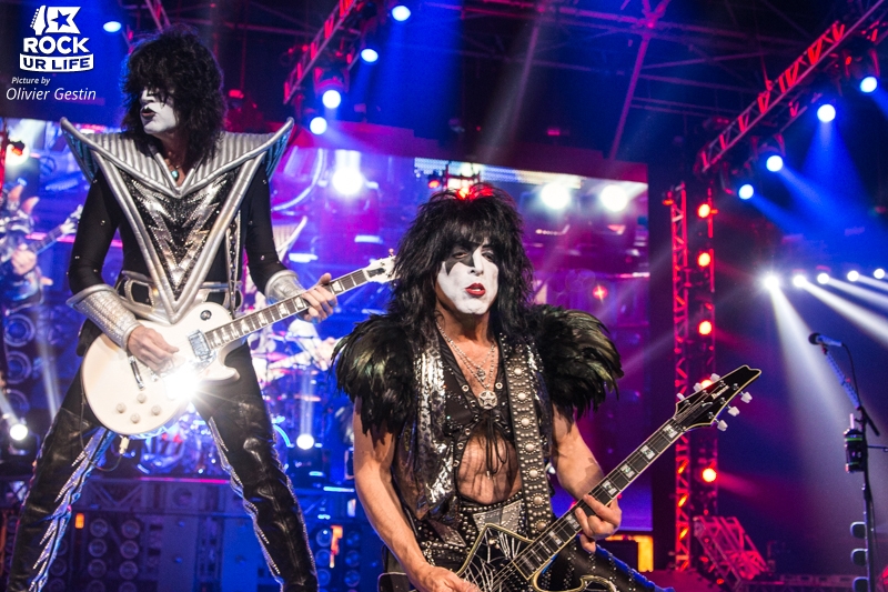 Cet agréable moment passé que la foule s’impatiente avec encore plus d’insistance. Les techniciens accélèrent la cadence sur scène tandis qu’un grand voile noir cache maintenant la scène. “Good Times Bad Times” résonne et le Zénith plonge dans le noir. La mythique catchphrase présente le groupe et les premiers riffs sonnent. KISS fait son apparition avec “Detroit Rock City”. Paul Stanley, Gene Simmons et Tommy Thayer s’avancent tandis qu’Eric Singer martèle son kit. Le show lumière fait d’emblée son effet, la dynamique imprimée par chaque spot est remarquable et l’écran géant, en fond de scène, ajoute plus encore d’animations vidéos. Sorti en 2012, leur dernier album en date “Monster” ne sera représenté que par un unique morceau. Comme toujours, les Américains vont proposer un show best of et c’est ce à quoi les spectateurs rêvent depuis le jour où ils ont acheté leurs précieux sésames. De “Psycho Circus” en passant à “Creatures Of The Night”, les quatre et surtout Paul seront à un tout autre niveau comparé à leur prestation, en demi-teinte, du Hellfest 2013. Stanley sera d’ailleurs bien bavard, n’hésitant à parler en français et ce à de nombreuses reprises. Une bonne chose qui casse l’image rockstar “on fait notre show et on s’en va” qui peut leur coller à la peau. Comme toujours, le show est agrémenté de flammes, pétards en tout genre et spots colorés de toute part. Gene crachera sa traditionnelle flamme, sa vive dose de sang -oh mon Dieu, un adorateur de Satan-, poussera également la chansonnette -comme toujours- et ce à quelques mètres de la scène, vers ce que l’on peut traditionnellement appeler le plafond. Paul traversera lui la foule, vers une plateforme installée dans les gradins. Il en profitera pour faire monter deux jeunes enfants, pour le plus grand plaisir de ces derniers et de leurs parents. KISS maitrise son show et tient son public. Les hits s’enchainent et l’assemblée observe et déguste ce show. Habitué à des représentations plus intense, on se rend compte plus facilement de l’ambiance qu’il pourrait y avoir en Amérique du Nord. Le public est statique, peu de têtes bougent; il ne manquait plus que les chaises dans le pit et nous y étions pour de vrai. Néanmoins, même si la dynamique fut un poil lente et les transitions trop longues, KISS a tout déballé du show à l’américaine et on les remercie chaleureusement ! “I Was Made For Lovin’ You” ne sera cette fois-ci pas oubliée (contrairement au Hellfest 2013), pour notre plus grand plaisir et “Rock And Roll All Nite” mettra fin, sous une pluie de cotillons, au set !