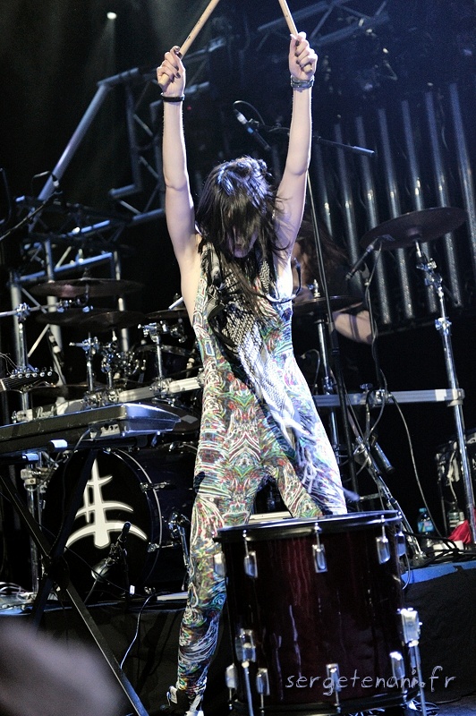 Tout juste formé en 2011, THIS IS SHE est un combo américain évoluant dans un style rock électro. Alors quel rapport avec Lacuna Coil, me direz-vous ? Très bonne question… Un set avoisinant la demi-heure de jeu, pour ce jeune trio originaire de Los Angeles, qui aura animé ce début de soirée. L’atout numéro un est, sans aucun doute, la charmante frontwoman Alana Grace. Avec de belles capacités vocales, cette voix très orienté pop aura tout de même un peu de mal à conquérir l’ensemble de l’Alhambra, le décalage avec la tête d’affiche étant trop important. L’utilisation de beats, samples, tablette électro et synthé créent, malgré tout, une belle harmonie dans ce style. D’ailleurs, le guitariste usera de nombreux effets, rendant sa guitare plus électro que rock, d’où un décalage encore plus prononcé de cette façon. Beaucoup d’énergie et bien qu’une timidité évidente pour cette jeune formation, la prestation sera réussie. Le dernier morceau sera, à notre grande surprise, entièrement instrumental, digne d’un morceau passant en boite de nuit, rendant l’atmosphère un peu pesante. Mais le public n’est pas rancunier et c’est sous une pluie d’applaudissement que s’achève leur passage.