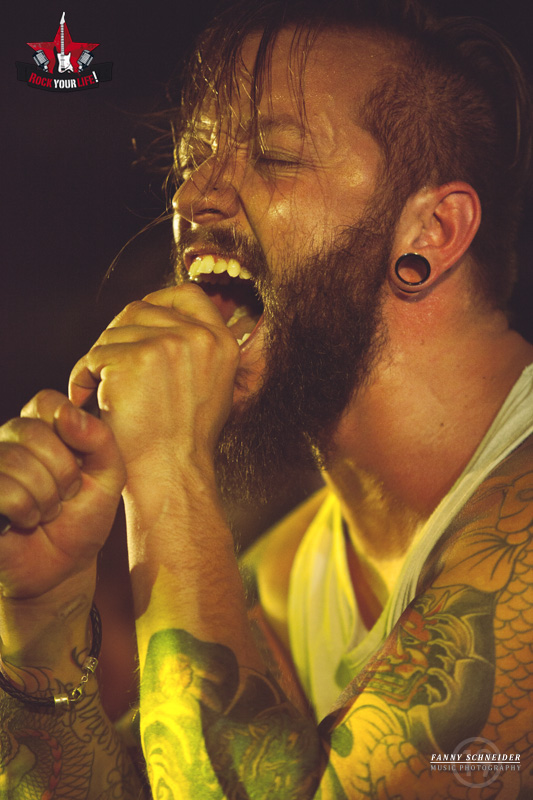 L’ambiance monte d’un gros cran avec l’arrivée de THE BUTCHER’S RODEO sur scène. Groupe émergent de la scène française qui a déjà son petit lot de fans, la boucherie commence dans une salle déjà plus remplie. Dès les cinq premières secondes, Vince, qui assure le chant non seulement pour TBR mais également pour AqME, nous livre la première claque musicale de cette soirée et possède une telle présence scènique qu’il nous rappellerait presque Mitch Lucker. Le public parisien a affaire à un combo surchauffé et décidé à retourner ce Batofar, et afin de motiver la foule, l’un des guitaristes viendra même s’infiltrer dans le public et pousser certains à se remuer. Dans une scène française qui donne naissance à de plus en plus de groupes tendant à se ressembler musicalement, The Butcher’s Rodeo se démarque et promet un futur prometteur, avec notamment un EP “Ghosts In The Weirdest Places” à paraître en octobre prochain.