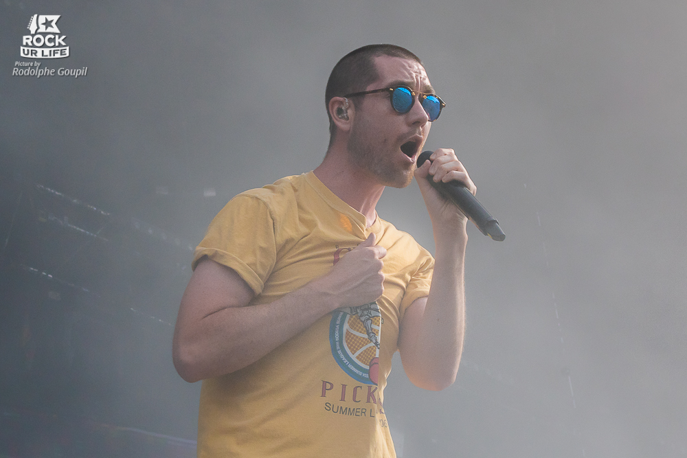 BASTILLE (Main Stage 2) – Festival oblige, la scénographie du quatuor anglais indie pop, si rare dans nos contrées, est on ne peut plus basique : en fond de scène trône le backdrop représentant le signe distinctif de Dan Smith et ses acolytes, à savoir un triangle rouge sur fond de neige télévisuelle alors que les écrans de chaque côté de la Main Stage 2 retransmettent en direct la performance avec des effets visuels. Mais ce qui frappe d’emblée, c’est le nouveau look du chanteur, arborant désormais un crâne rasé. Côté prestation, tous les classiques sont de la partie (“Flaws” et le bain de foule du frontman, “Things We Lost In The Fire”, “Good Grief”) sans oublier la reprise “Of The Night” sur laquelle Dan fera asseoir les festivaliers avant de les faire sauter, mais aussi les avants-premières françaises des deux derniers singles “World Gone Mad” et “Quarter Past Midnight” dont le clip a été tournée à Paris. La clôture du set se fait comme à tous les concerts de Bastille sur le célèbre “Pompeii” qui fera chanter et danser tout le monde, résumant parfaitement le show : énergique et fédérateur !