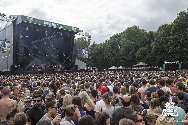RUDIMENTAL (Green Room) – En fin d’après midi, c’est le quatuor drum n’ bass/électro qui investit la Green Room. Le concert, initialement prévu sur la scène principale, est grandiose. Pour la scène, la formation est largement agrandie : chanteurs et chanteuses, choristes, DJ, cuivres, percussions… Une bonne dizaine de personnes sont sur scène ! La foule s’agrandit à chaque morceau, reconnaissant la qualité du set. Le tube “I’m Not Giving In” arrive finalement en fin de set, voyant le public s’emballer et danser.