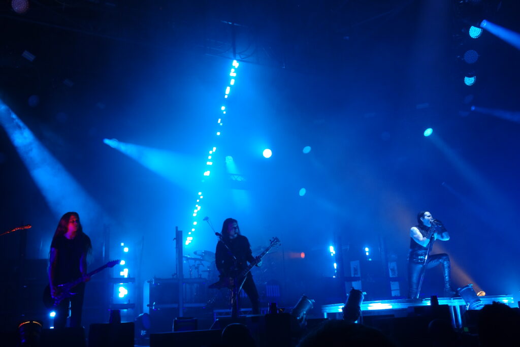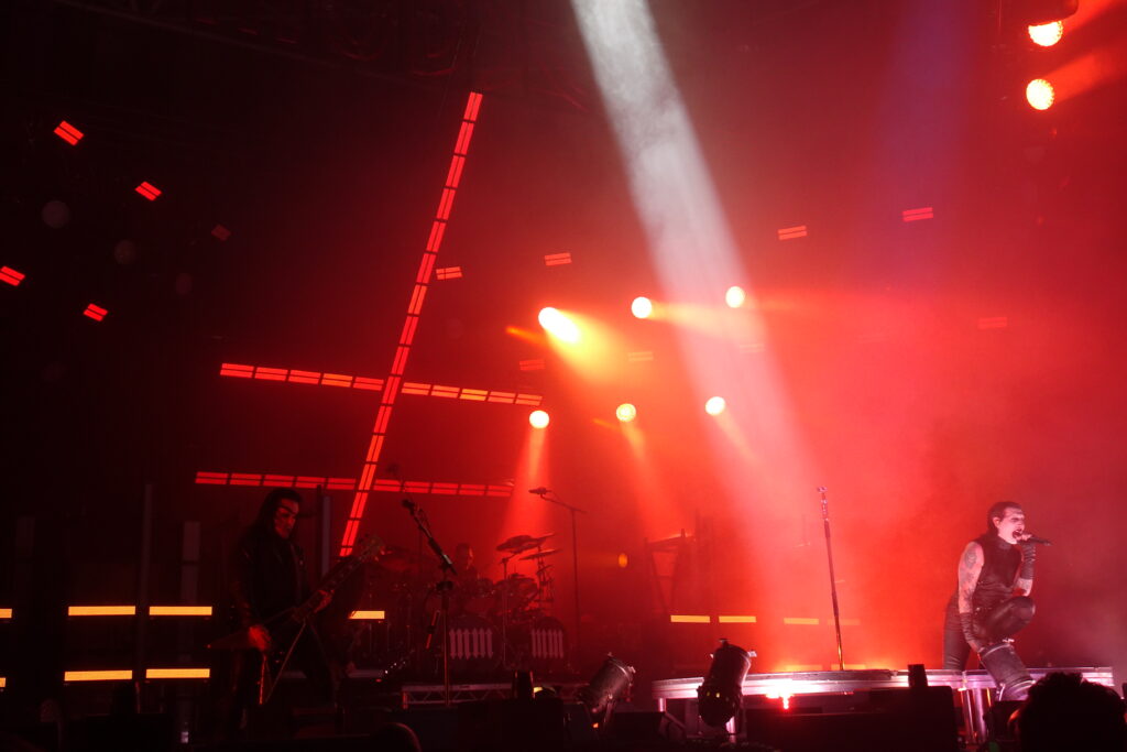 Manson livre un set millimétré, découpé comme un rituel. Il revient après un court interlude avec “Sacrilegious”, single hypnotique qui fait onduler la fosse en une marée sombre. Sur scène, la mythique double croix brille en néon, tandis que les lumières sculptent une atmosphère à la fois mystique et électrique. Malgré les années, Manson n’a rien perdu de sa rage, au contraire, il semble renaître, plus féroce que jamais.