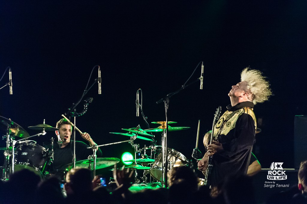 Court entracte avant que les lumières ne s’éteignent de nouveau. Plongés dans l’obscurité, on n’entend que quelques sons électroniques, entrecoupés d’extraits vocaux. Seules les deux batteries qui trônent au centre de la scène sont éclairées. Les MELVINS arrivent alors, sobrement, avec en tête le leader Buzz Osbourne, sa touffe de cheveux gris et son pull noir parsemé d’yeux. Avant le premier morceau, le set démarre bien évidemment par un solo de batteries. Dale Crover et Coady Willis cognent fort et bien, tantôt en dialogue tantôt à l’unisson. Visuellement, c’est une véritable danse qui s’offre à nous, et c’est aussi eau à voir qu’à entendre. Les deux compères réitéreront d’ailleurs tout au long du spectacle. La guitare et la basse entrent alors en jeu pour le premier titre, “Onions Make The Milk Taste Bad”.