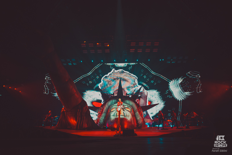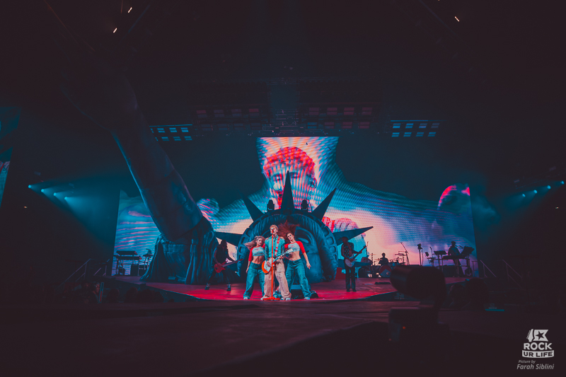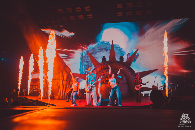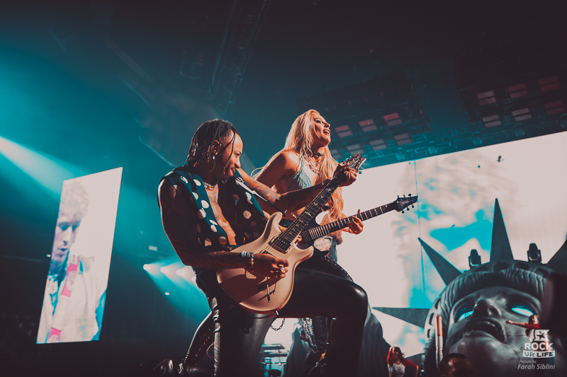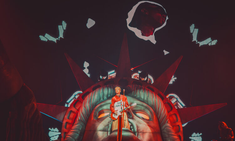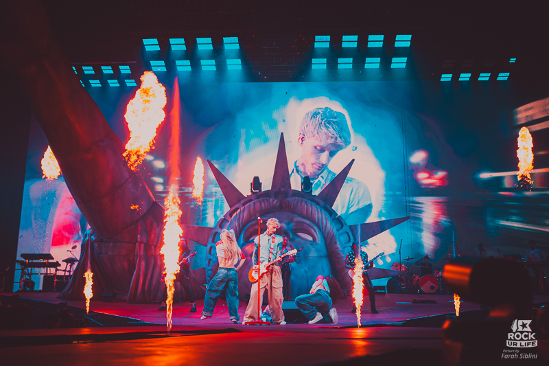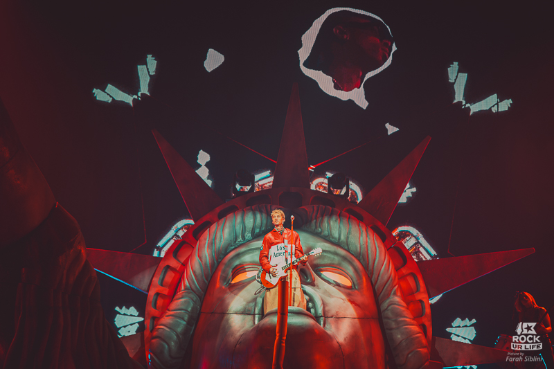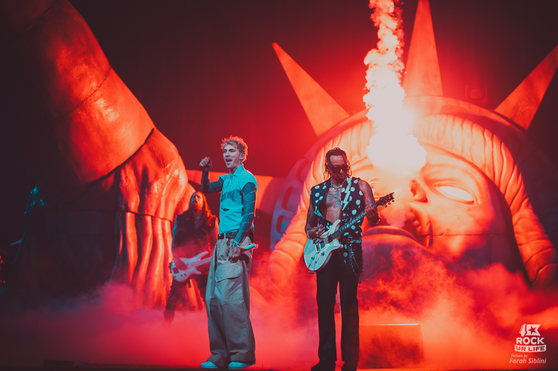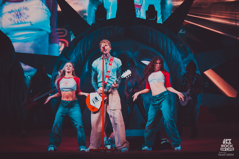 Une voix off s’élève dans l’Adidas Arena et retrace brièvement le parcours de Colson Baker et le contexte de l’album Lost Americana que l’artiste est venu défendre ce soir. Le décor est planté, le rideau rouge tombe et dévoile une scénographie spectaculaire : Une Statue De La Liberté bras levé vers le ciel. Elle ne brandit pas une flamme mais une cigarette. Un ton provocateur, grandiloquent, américain jusqu’au bout des symboles. Le décor impressionne par son ampleur, même si la structure relègue les musiciens au second plan, parfois dissimulés derrière cette masse imposante.