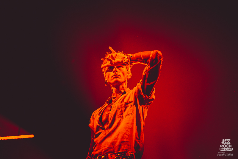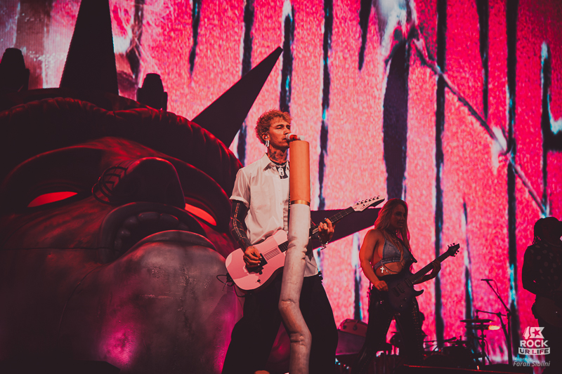 Car ce soir, la “vraie” star, c’est lui. MACHINE GUN KELLY émerge de la bouche de la Statue dans un nuage de fumée avec au même instant une guitare descendant des hauteurs de l’Arena suspendue à un câble. L’effet est immédiat et l’Adidas Arena explose sous les applaudissements. Il attaque avec “Outlaw Overture”, titre d’ouverture de Lost Americana. Le public répond présent, même si une légère distance subsiste au début due à la hauteur de la structure. Très vite, MGK quitte son perchoir pour s’avancer vers l’avant-scène sur “Starman” où la guitare laisse place au micro. Les premiers rangs s’animent davantage à l’approche du chanteur. Sur scène, chaque geste semble pensé et chorégraphié occupant ainsi l’espace avec une précision presque millimétrée et ne laissant aucun recoin de la scène inexploré.