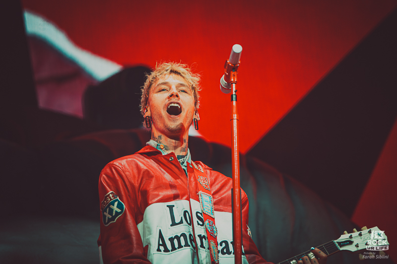 La guitare rose emblématique de la pochette de Tickets To My Downfall est donc de sortie pour “title track”, devenu un classique de son répertoire. Sur “Bloody Valentine”, plusieurs fans (exclusivement féminines…) montent sur scène, dont une jeune enfant avec laquelle le chanteur partage un moment particulièrement touchant. Ces instants de proximité ponctuent le show, dont l’un des passages les plus marquants survient lorsque résonnent les premières notes de “Twin Flame”. Visiblement ému, mgk annonce qu’il ne chantera pas le morceau ce soir-là. La chanson évoque sa relation avec Megan Fox et l’enfant qu’ils ont perdu, un sujet dont la charge émotionnelle dépasse largement le cadre du concert. Il laisse alors le public chanter à sa place avant qu’il ne revienne pour les dernières lignes où l’émotion est contenue mais évidente.