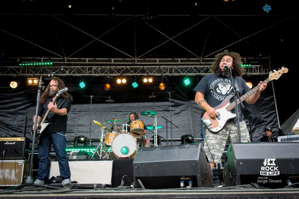 MOBÜTU (Supositor Stage) – Mobütu : soyons clairs, lorsqu’on lit ce nom, ce n’est pas à un groupe de musique que l’on pense en premier lieu. Et pourtant, s’il en fallait un pour secouer tous les endormis du festival en ce dimanche, Mobütu était le choix parfait. Ils ont mis un bon coup de boost à tout le monde. Pour sûr, du power, ils nous en ont servi et dans tous les sens du terme ! Un son lourd et juteux, une énergie débordante, tous les ingrédients étaient réunis pour nous faire passer un bon moment. Evidemment, au premier “coup d’oreille”, le nom qui vient à l’esprit est sans conteste celui de Motörhead. Il y a quelque chose, c’est indéniable, et la voix du chanteur Mäthurin y est pour beaucoup. C’est bluffant. On y retrouve également de vieux relents de punk bien speed et de rock n’roll bien gras qui auront fait de ce set un très bon moment clôturé en beauté avec la reprise de “Surfin Bird” de The Trashmen (également reprise par rien de moins que les Ramones ou les Cramps).