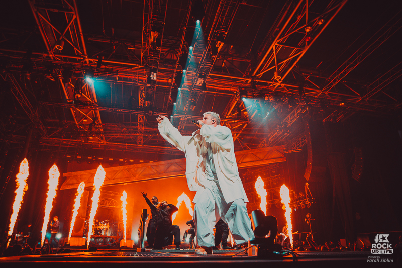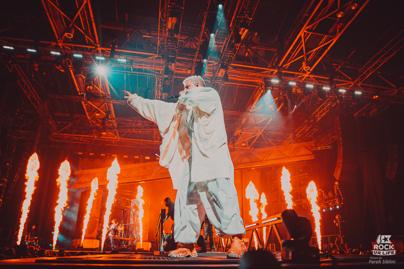 La dernière ligne droite est dantesque. “Bottom Feeder” rugit avant le rappel, puis un solo de batterie titanesque de Ben “Gaz” Gordon (qui se retrouve même la tête à l’envers !) précède “Crushed”, véritable déflagration scénique. Winston, juché sur le pont suspendu au plafond, domine une fosse en transe. Contrairement au dernier Zénith où les flammes se faisaient discrètes, elles jaillissent cette fois de partout : scène principale, scène B, flancs du pont.