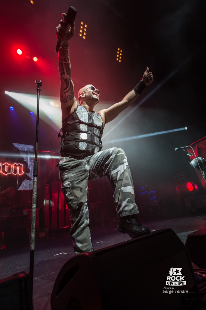 Accept était-il notre échauffement militaire ? Ça y est, en tout cas, on est chaud et prêt à accueillir SABATON. C’est avec une reprise de “In The Army Now” de Status Quo que le show démarre sur les chapeaux de roues. L’écran géant s’allume et les Suédois débarquent vêtus de leurs habituels treillis militaires. L’écran géant sert à indiquer le contexte historique et à planter le décor. Des images de batailles défilent, ainsi que des cartes géographiques écrites en français. Entre cours d’histoire/géographie et entraînement militaire, nous sommes plongés dans une ambiance propice à la formation et bien différentes des groupes précédents.