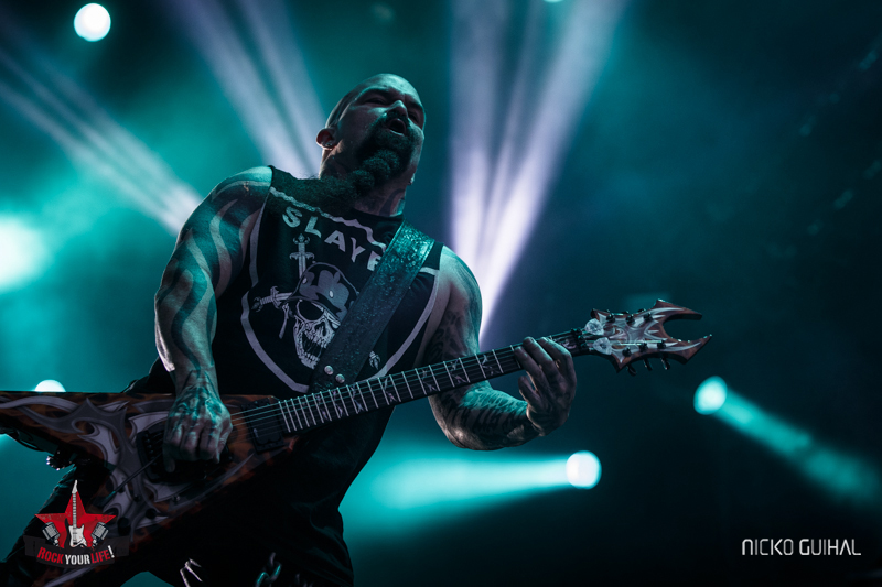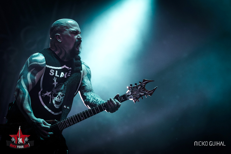 De lourdes notes de basse retentissent au loin, SLAYER est en soundcheck, il est temps de se diriger vers la scène Apollo. Le public se tasse pour voir ces légendes du Big 4. De retour au Sonisphère où ils avaient déjà joué en 2011. La formation thrash metal que l’on ne présente plus réserve ce qui va s’avérer être l’un des meilleurs shows de la journée. Un son aux petits oignons, un light show époustouflant (défi pour les photographes massés dans le pit). La guitare est l’une des vraies pierres angulaires de Slayer, ça joue sévère. La technicité des syncopes, stops, changements de tempo et de tonalités, pas étonnant qu’une folie contagieuse s’empare de la fosse juste au bout de trois ou quatre mesures. Bien évidemment, un hommage sera rendu à leur ami et partenaire décédé il y a peu, Jeff Hanneman. Des sous-bock aux couleurs d’Heineken (la bière préférée de Jeff) s’affichent sur les écrans, la marque est remplacée par le nom et prénom de cet homme parti trop tôt. Moment d’émotion que tous célèbrent avec ferveur. Celui-ci est remplacé haut la main par Gary Holt (Exodus) alors que Paul Bostaph reprend officiellement son poste de batteur, remplaçant ainsi Dave Lombardo…
