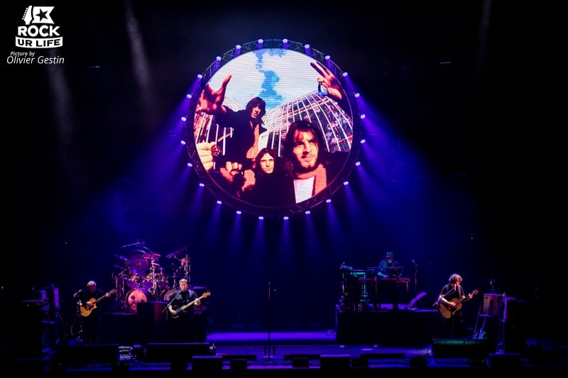 19h10. Les lumières de la salle s’éteignent, celles sur scène s’allument. Le groupe commence la première partie du show avec “Obscured By Clouds”. Un immense drap blanc cache tout ce qu’il se passe derrière. Avec un magnifique jeu d’ombres et de lumières, les silhouettes des musiciens apparaissent sur le voilage. Des cercles bleus s’animent sur le drap, bougeant en rythme et se mariant avec les ombres du groupe.