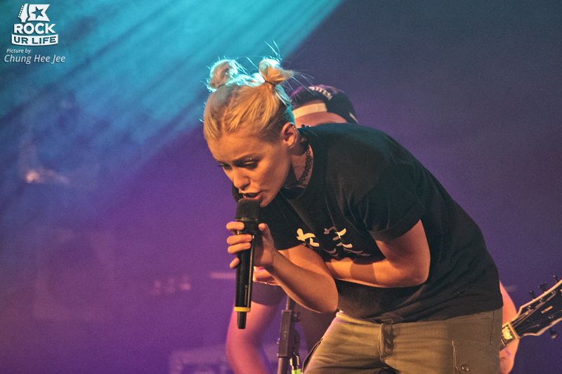 Un changement de plateau et une arrivée un peu massive de retardataires plus tard, c’est finalement au tour du quintette australien de donner tout ce qu’il a dans le ventre et de s’échauffer en prévision du 6 mars prochain – date de sortie de son nouvel album “Limitless” -. Tout en sobriété, c’est en backstage que débute le concert de TONIGHT ALIVE, avec une intro rythmée par les notes de “To Be Free” et quelques vocalises de Jenna McDougall. Sans attendre, les cinq musiciens rejoignent la scène et se lancent dans ce qui sera appelé plus tard un show simple et sans complexe. Avec le dessous du crane rasé et deux chignons en guise de coiffure, la chanteuse rentre très rapidement dans le vif du sujet, émerveillée au même titre que ses quatre camarades par la foule ayant fait le déplacement. Cette dernière est d’ailleurs vite remerciée par l’enchaînement des mélodies “The Ocean” / “Hell And Back”, issues du décent “The Other Side” (2013). Les voix sont au point, les instruments à cordes également, reste seulement le batteur et ses quelques petites erreurs justifiables par la fatigue ou la joie, tout simplement. Accompagnant le tout, les lumières offrent quant à elle un spectacle secondaire attirant, toujours en complémentarité de la performance musicale. Mais même si l’heure est principalement au son, comme le prouve par la suite le très élégant “What Are You So Scared Of?”, le centre d’attention de ce set reste sans équivoque la frontman qui, perchée sur des plateformes surélevées, assure la pérennité du divertissement : mouvements de danse, signes de remerciement de la main, sourires sincères et regards personnalisés, tout y est pour inclure sans exception tout le monde, sans préférence, ni favoritisme.